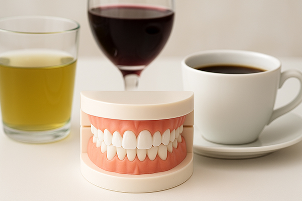 歯が黄ばんで見える主な原因は、食事に含まれるポリフェノールやカテキンなどが歯の表面に付着してできるステイン。